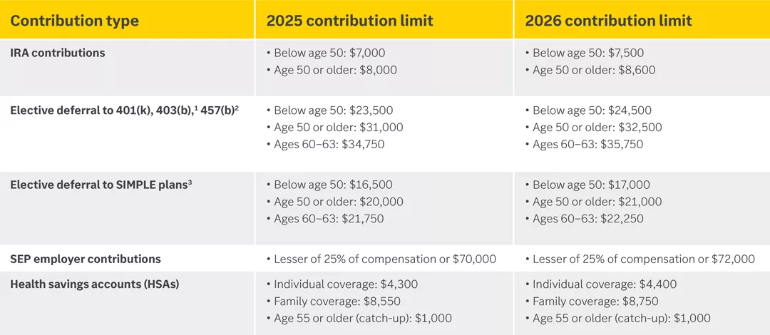 If you’re still working on your 2025 taxes, you can make contributions to IRA and HSA accounts until April 15, 2026. SEP IRA contributions (for business owners and self-employed individuals) can be made through your tax-filing deadline, including extensions.